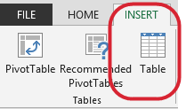 Voit muuntaa taulukoksi minkä tahansa alueen, jossa on otsikkorivi ja tietorivejä. Muuntaminen tapahtuu valitsemalla alue ja komennolla Insert > Table (Lisää > Taulukko) tai Home > Format as Table (Aloitus > Muotoile taulukoksi).