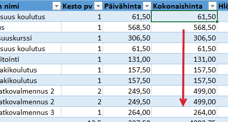 | Päivähinta-sarakkeeseen viittaaminen | Range(”Koulutukset[Päivähinta]”) |