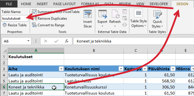 Kun valitset solun muunnetun alueen sisältä, valintanauhassa näytetään taulukon käsittelyyn tarkoitettu Design (Rakenne) –välilehti. Ensitöiksesi taulukolle on hyvä antaa kuvaava nimi.