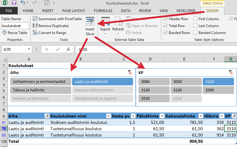 Excel 2013 –versiossa voit suodattaa taulukkoa myös osittajien (slicers) avulla.