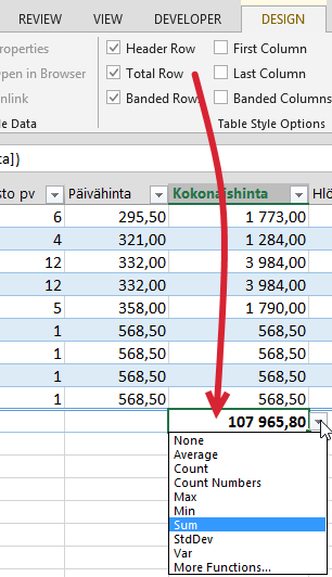Saat esiin summarivin, jolta voit valita taulukon alapuolelle yhteenvetotuloksia, jotka reagoivat myös taulukon suodattamiseen.