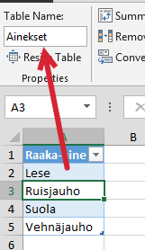 Muuta ensin luettelosi taulukoksi ja anna sille myös kuvaava nimi Design (Rakenne) –välilehdeltä: