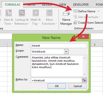 Lisää työkirjaan tämän jälkeen myös tavallinen aluenimi Formulas > Define Name (Kaavat > Määritä nimi) –toiminnolla ja määritä Refers to (Viittaus) –kenttää juuri luomasi taulukon nimi:
