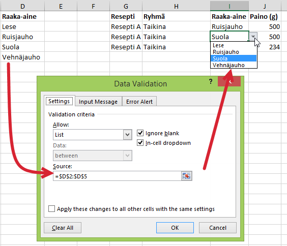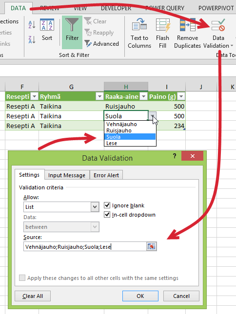 H-sarakkeeseen on luotu kelpoisuustarkistus (Data > Validation, Tiedot > Kelpoisuustarkistus), joten soluihin hyväksytään vain jokin neljästä luetellusta raaka-aineesta: