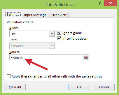 … nimittäin taulukot ovat olleet Excelissä vasta 2007-versiosta lähtien ja valitettavasti Microsoftin Excel tiimi on unohtanut päivittää kelpoisuustarkistus-toiminnon uudelle taulukko-aikakaudelle. Kelpoisuustarkistusikkuna ei hyväksy lähdealueeksi taulukon nimeä, vaikka kuinka yrittäisit. Tavalliset Excelin aluenimet sille kyllä kelpaavat, mutta taulukkonimet eivät. Piste.