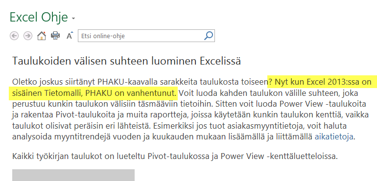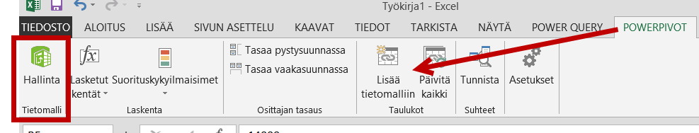 Edellä kuvattu on kuitenkin vain pintasipaisu kaikista uusista mahdollisuuksista. Jos käytössäsi on Excel 2013 Professional Plus tai Office 365 ProPlus tai ns. Excel 2013 Standalone –versio, voit aktivoida käyttöösi Power Pivotin, jolloin pääset myös tarkastelemaan ja muokkaamaan tietomallia. Aktivointiohjeet löytyvät täältä.