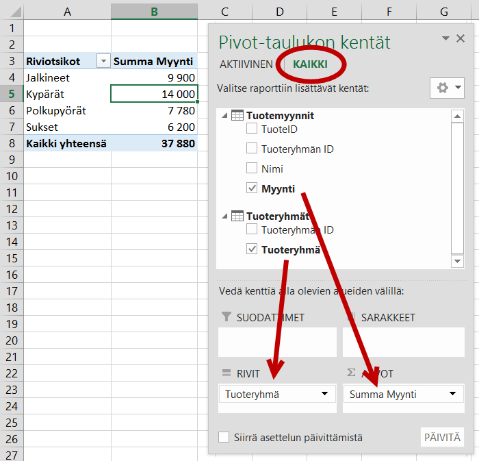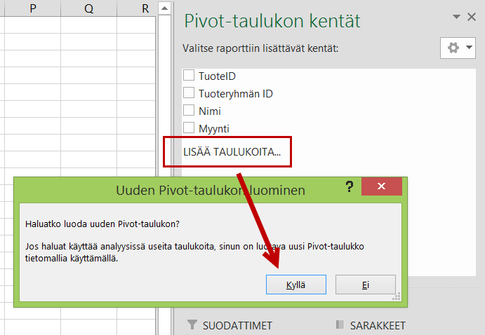 Ja voit valita pivot-taulukoihin kenttiä useista tauluista.