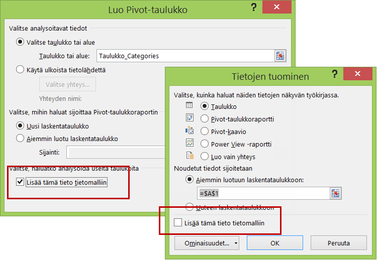 Excel 2013 –versiossa voit huomata useissakin eri ikkunoissa vaihtoehdon Lisää tietomalliin (Add to Data Model), jonka avulla voit lisätä luetteloita tietomalliin. Vaihtoehto on tarjolla mm. pivot-taulukon luonnin yhteydessä sekä erilaisissa tietojen tuonti-ikkunoissa.