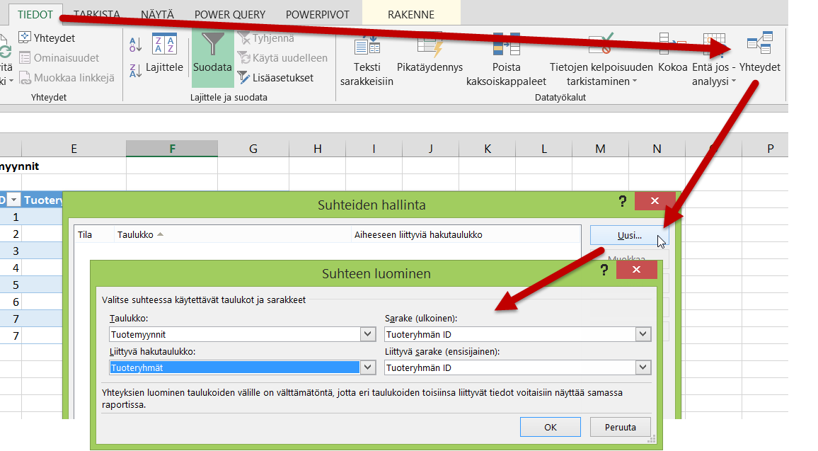 Kun olet lisännyt haluamasi taulut tietomalliin, taulujen välille pitää luoda yhteydet. Jotta yhteyksien luonti on mahdollista, molemmissa tauluissa pitää olla yhdistävä sarake, kuten tuoteryhmän tunnus. Yhdistävän tiedon pitää sisältää toisessa luettelossa vain uniikkeja arvoja, aivan kuten VLOOKUP-funktion käytön yhteydessäkin. Esimerkiksi kunkin tuoteryhmän ID-tunnuksen tulee olla Tuoteryhmät-taulussa vain kerran.