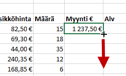 Voit kopioida kaavan alas kaksoisnapsauttamalla solun oikean alakulman täyttökahvaa, jos vasemmanpuoleisessa sarakkeessa on tietoja.