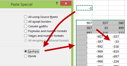 Voit suorittaa soluissa oleville luvuille yksinkertaisia laskutoimituksia myös ilman kaavoja. Voit esimerkiksi muuntaa alueen luvut negatiivisiksi kopioimalla leikepöydälle luvun -1, valitsemalla kohdealueen ja komennon Paste Special > Multiply (Liitä määräten > Kerro).