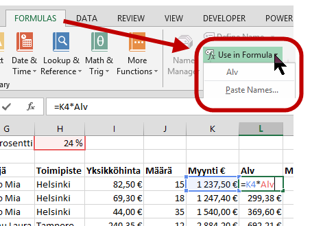 Kun nimeät soluja ja käytät nimiä kaavoissa, tarvitset vain harvoin $-merkkejä. Nimi vastaa absoluuttista viittausta (kuten $H$1). Nimien avulla saat myös kaavoistasi helpommin ymmärrettäviä: =IF(Myynti > Raja; Myynti * Bonusprosentti; 0)