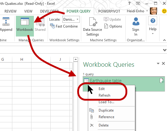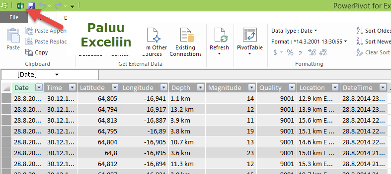 Tuo Excelissä esiin työkirjassa oleva kysely Power Query > Workbook (Power Query > Työkirja) –toiminnolla. Pääset muokkaamaan ja tutkimaan kyselyä pikavalikosta Edit (Muokkaa) -komennolla. Tai voit suorittaa kyselyn päivityksen Refresh (Päivitä) -komennolla. Kysely päivittää datan http://en.vedur.is/earthquakes-and-volcanism/earthquakes/vatnajokull/#view=table –sivulta ja lataa sen Power Pivotin tietomalliin.