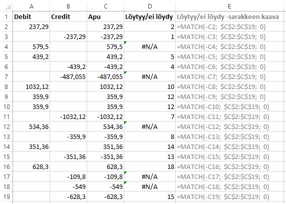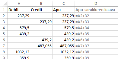 Tämän ohjeen avulla löydät ne kredit ja debit -viennit, joille ei löydy ”toisen merkkistä” paria. Muodosta ensin apusarake, johon keräät sekä debit että credit -luvut. Voit luoda apusarakkeen yhteenlaskukaavalla.