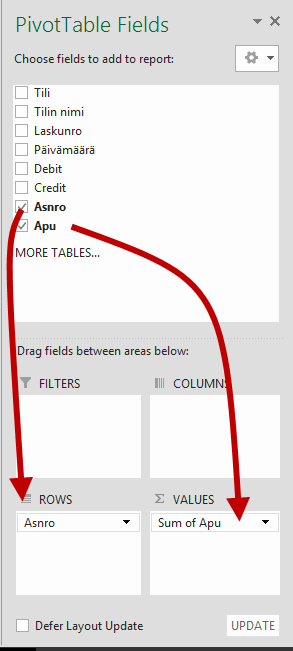 - Kun Excel on luonut tyhjän pivot-rungon ja tuonut esiin pivot-taulukon luontia varten kenttäluettelon, vedä asiakasnumero rivialueelle (rows) ja apusarake arvoalueelle (values).
