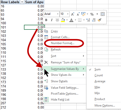 - Tämän jälkeen voit tarkistaa pivot-taulukon lukujen päältä avautuvasta pikavalikosta, että laskutoimituksena on summa ja halutessasi muotoilla pivot-taulukon luvut haluamaasi muotoon.