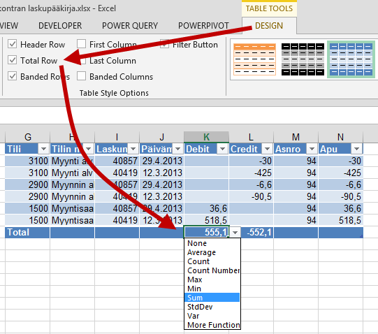 - Valitse yksi solu aineiston sisältä (esim. laskupääkirjaluettelo).