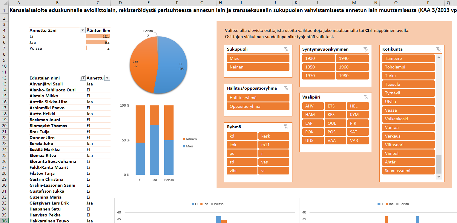 Avioliittolakiin liittyvä täysistunnon äänestys innosti toteuttamaan Exceliin Power Pivot -tietomallin, jonka avulla voi helposti tutkia minkä tahansa kauden 2011-2015 täysistunnon äänestyksen tulosta.