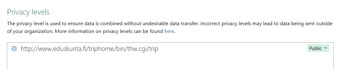Päivitä tulokset työkirjassa olevan ohjeen perusteella antamalla kaksi päivityskomentoa. Kyselyt on toteutettu Power Queryllä ja kyselyt lataavat tiedot Power Pivotin tietomalliin. Päivitys onnistuu, mikäli Äänestystulos-sivun rakenne ei muutu eikä vaihtele äänestyksittäin. Ennen päivitystä sinun pitää määrittää tietolähteiden julkisuustasot (ks. seuraava kuva).