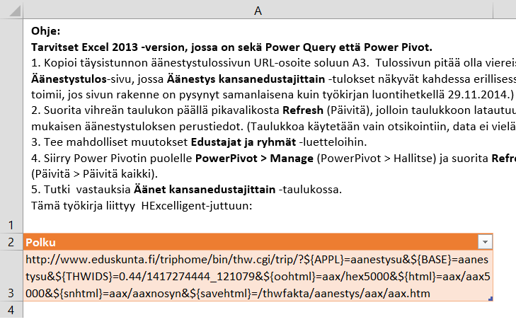 EDIT 29.1.2015: Selvisi, että jokaisen äänestyksen URL-päivittyy Eduskunnan järjestelmässä dynaamisesti. Tämänpäiväinen linkki ei toimi enää huomenna. Kopioi siis äänestystulossivulla tämänhetkinen linkki, jos yrität päivittää blogissa jaettujen työkirjojen tiedot.