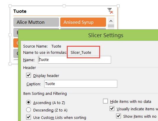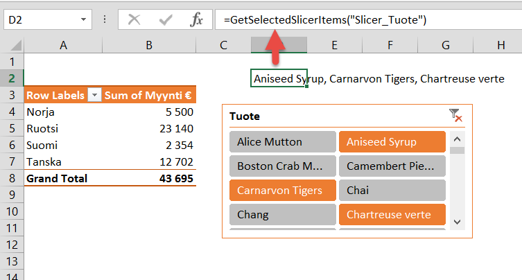 Tämän jälkeen voit käyttää kopioimaasi GetSelectedSlicerItems-funktiota Excelin solussa antamalla funktiolle argumentiksi osittajan nimen (huomaa, että nimi on eri asia kuin osittajan otsikko). Funktio muodostaa pilkulla erotetun listan valituista arvoista.
