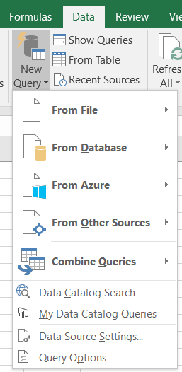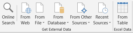 Tuontikomennot on koottu Data (Tiedot) -välilehdelle yhdeksi ryhmäksi. Versiosta riippuen kyselyn luonti aloitetaan New Query tai Get Data -nimisellä painikkeella. Lisäksi Data-välilehdeltä voi avata kyselypaneelin (Show Queries tai Queries & Connections versiosta riippuen) sekä ryhtyä tekemään kyselyä taulukoksi muunnetusta alueesta (From Table).