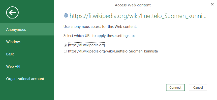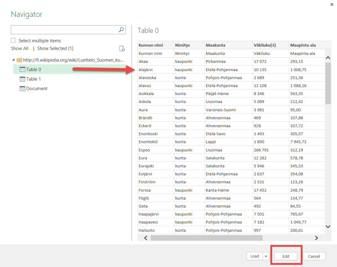 Seuraavan esimerkin avulla kuvataan kyselyn luonnin perusidea. Esimerkissä noudetaan lista Suomen kunnista Wikipedian sivulta https://fi.wikipedia.org/wiki/Luettelo_Suomen_kunnista, mutta samat perusperiaatteet pätevät moniin muihin tietolähteisiin. Toki tietolähdekohtaisia eroja on ja juttusarjassa tullaan esittelemään tarkemmin myös muita vaihtoehtoja.