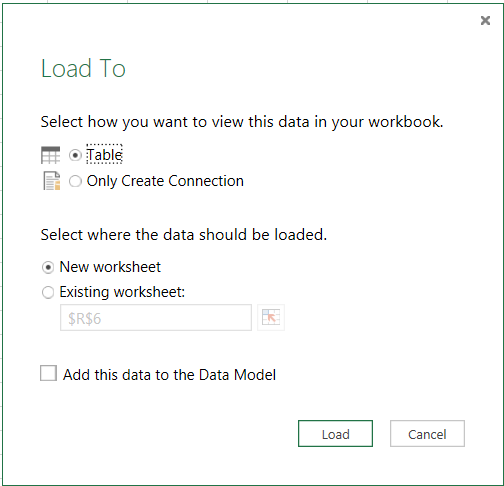 • Excel 2013 tai 2016 -versiossa voi valita vaihtoehdon Add this to the Data Model (Lisää nämä tiedot tietomalliin) jolloin tulos latautuu Power Pivotin tietomalliin ja taulun nimeksi tulee kyselylle antamasi nimi. Yleensä tietoja ei tällöin ladata duplikaattina Exceliin, joten Table (Taulukko) -vaihtoehto vaihdetaan Only Create Connection (Luo vain yhteys) -vaihtoehdoksi.