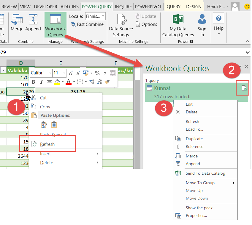 Kun tiedot on ladattu Exceliin, voit suorittaa kyselyn päivityksen monella eri tavalla.