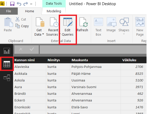 Huomaa Power BI Desktopissa: Power Query -ikkuna saattaa jäädä piiloon Power BI Desktop -ikkunan taakse, kun olet painanut Edit-painiketta. Siirry tällöin itse Power Query -ikkunaan.Power BI Desktopin pääikkuna sekä juuri avautunut kyselyeditori-ikkuna muistuttavat toisiaan hyvin paljon, joten joskus voi olla hankala havaita kummassa ikkunassa milloinkin olet. Kokeile siirtymällä ikkunasta toiseen ja huomioi ikkunoiden erot.