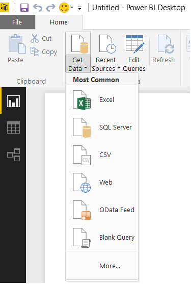 Jos tuot tietoja Power BI Desktopiin, aloitat kyselyn komennolla Home > Get Data.