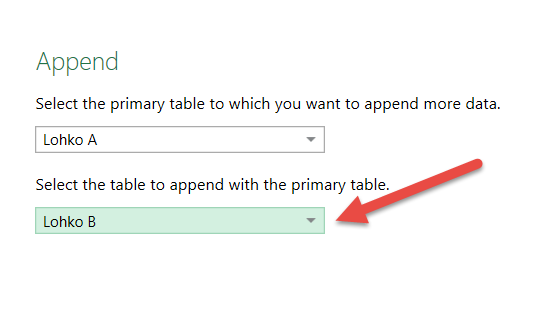 - Tai Append (Liitä loppuun) -toiminnolla, jolloin samankaltaisten kyselyiden tuloksia yhdistetään peräkkäin.