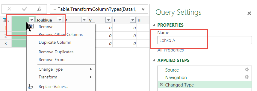 - Editori käynnistyy, joten anna kyselylle lyhyempi kuvaava nimi. Poista myös turha tyhjä sarake pikavalikon avulla.