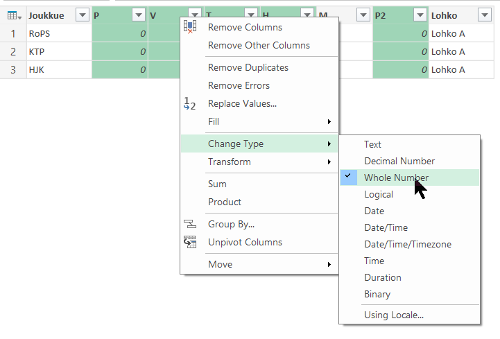 - Mikäli aiot laskea tiedoilla, varmista että numeeristen sarakkeiden tietotyyppinä on luku. (Lue lisätietoja tietotyypeistä Power Query: Käyttöliittymä ja perusperiaatteet -jutusta.)