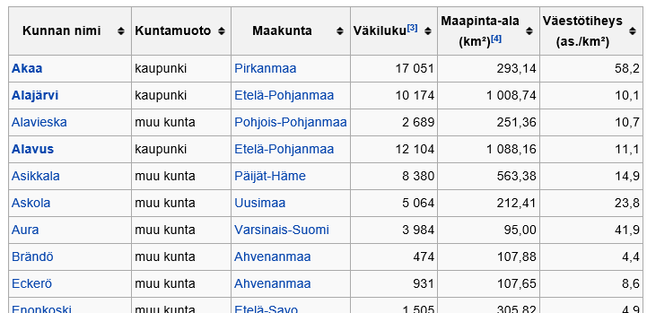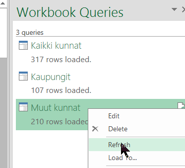 Reference jatkaa edellisen kyselyn tuloksesta. Käytetäänpä esimerkkinä Wikipedian kuntaluetteloa, josta tehtiin kysely jo aiemmin: Power Query: käyttöliittymä ja perusperiaatteet.