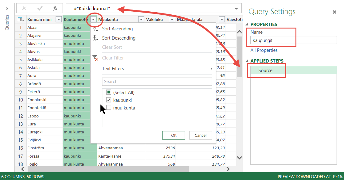 - Jos olet tuonut editoriin kaavarivin esiin (View > Formula bar, Näytä > Kaavarivi), näet että lähteenä on edellinen kysely ja voit jatkaa siitä mihin se jäi. Anna uudelle kyselyllä fiksu nimi, suodata kaupungit esiin ja toteuta muut haluamasi operaatiot, kuten Kuntamuoto-sarakkeen poistamisen.