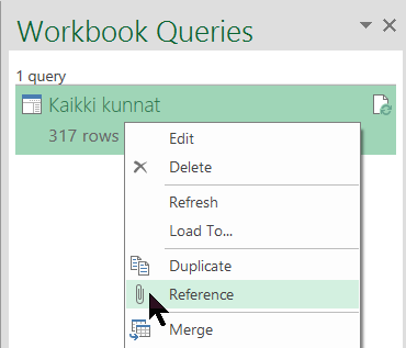 * Power BI Desktopissa siirtymällä muokkaamaan kyselyitä Home > Edit Queries -komennolla. - Valitse kyselyn päältä pikavalikosta Reference (Viittaa). (Power BI Desktopissa komento löytyy Queries-paneelista kyselyn pikavalikosta.)
