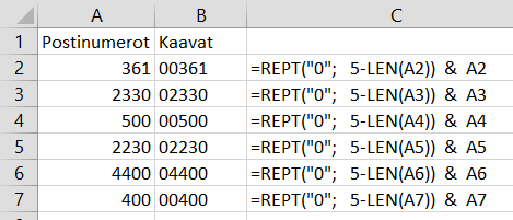 4. sekä liittää loppuun alkuperäisen merkkijonon: REPT(”0”;  5-LEN(A2))  & A2