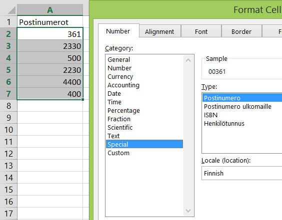 Saat luvut postinumeroiksi käyttämällä seuraavaa erikoissolumuotoilua.