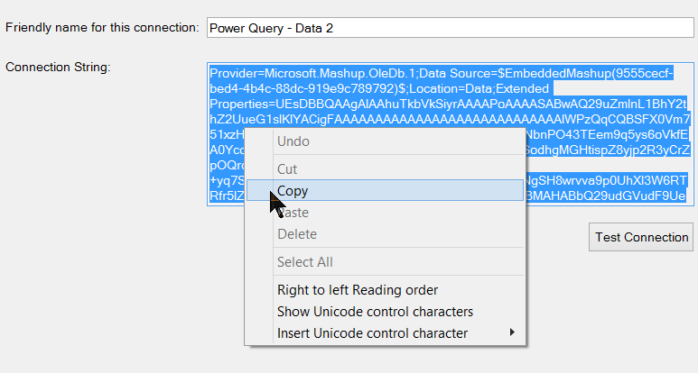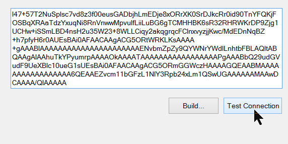- Tyhjennä ikkunassa näkyvä yhteysmerkkijono ja liitä tilalle se yhteysmerkkijono, jonka kopioit ja testaa sen toiminta Test Connection –painikkeella.