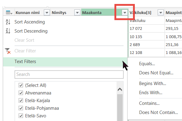 Edit 10/2016: Uusimmissa versioissa tietotyypit näkyvät sarakeotsikoissa. Jos symbolina lukee ABC ja 123, kyselyeditori ei ole pystynyt määrittämään tietotyyppiä. Määritä silloin tietotyyppi itse.