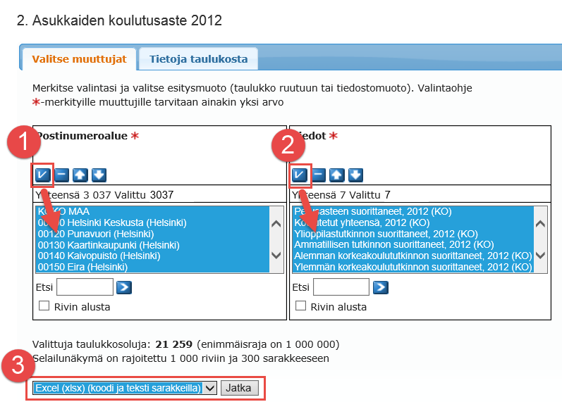 - Valitse sekä Postinumero että Tiedot -kentistä halutessasi kaikki tiedot ruuduissa olevilla kuittausmerkeillä. Valitse tulostiedostoksi Excel (xlsx) (koodi ja teksti sarakkeilla) ja Jatka.