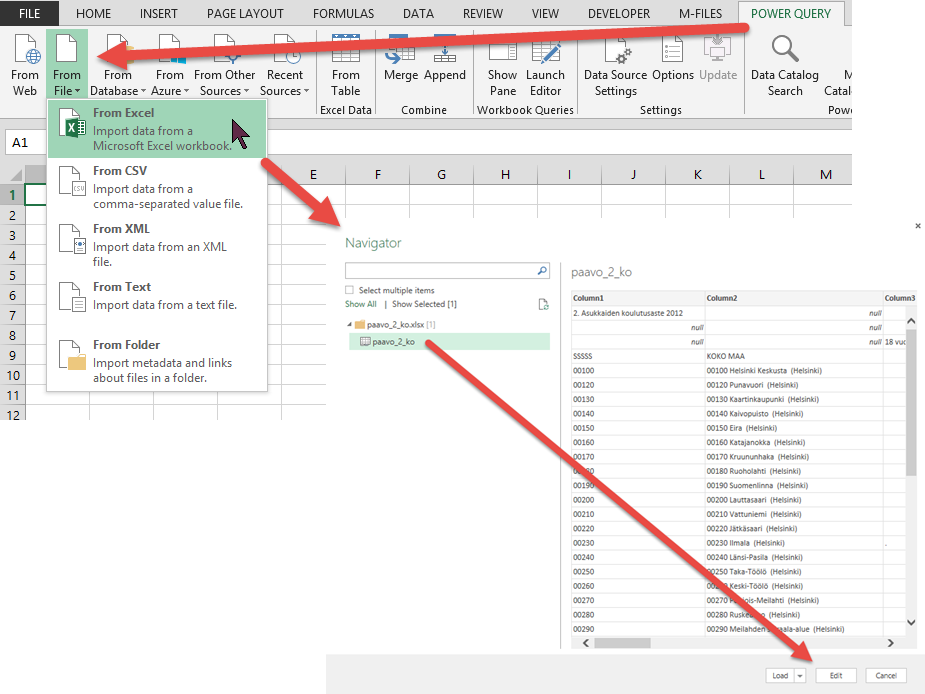 - Valitse Excel 2010 tai 2013 -versiossa Power Query > From File > From Excel (Power Query > Tiedostosta > Excelistä) ja valitse Tilastokeskuksen sivuilta tallentamasi Excel-tiedosto. Valitse vielä tiedostossa oleva taulukko (esim. paavo_2_ko) ja siirry Power Queryn puolelle Edit (Muokkaa) -komennolla. Excel 2016 -versiossa aloitat tuonnin komennolla Data > New Query > From File > From Workbook.
