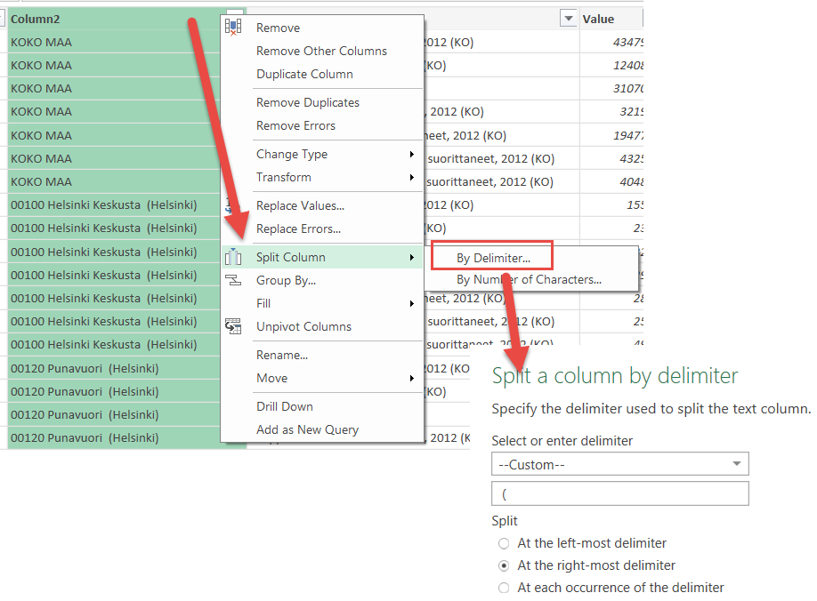 - Jaa vielä Column 2.1 -sarake Split Column > By Number of Characters (Jaa sarake osiin > Merkkien määrän mukaan) -komennolla viidennen merkin kohdalta, jotta kaupunginosasta muodostuu oma sarakkeensa.