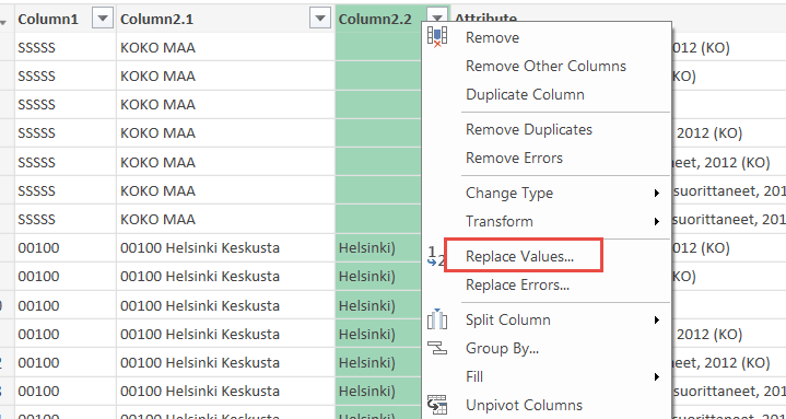 - Poista vielä turha sulkumerkki muodostuneesta sarakkeesta Replace Values (Korvaa arvot) -komennolla. Kirjoita Value to Find -kenttään sulkumerkki ja jätä Replace With -kenttä tyhjäksi, jolloin sulkeet korvataan pois.
