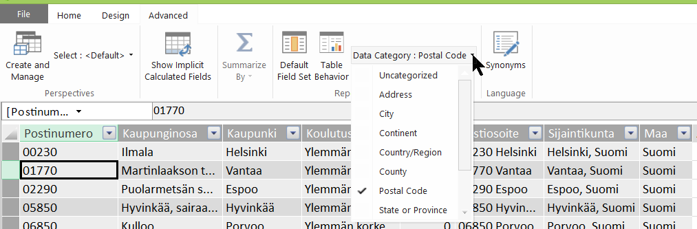 Jotta Power View ja 3D Map (ent. Power Map) tunnistavat suomenkielisiä kaupunkien nimiä, tietomallissa pitää käydä tekemässä muutamia määrityksiä.