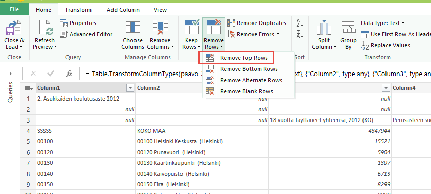 - Kun kyselyeditori on käynnistynyt, poista ensin aineiston yläpuolelta turhat rivit Home > Remove Rows > Remove Top Rows (Aloitus > Poista rivit > Poista ylimmät rivit) -komennolla ja syöttämällä poistettavien rivien lukumäärän (2).
