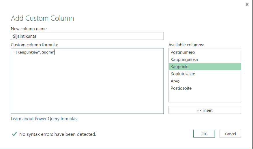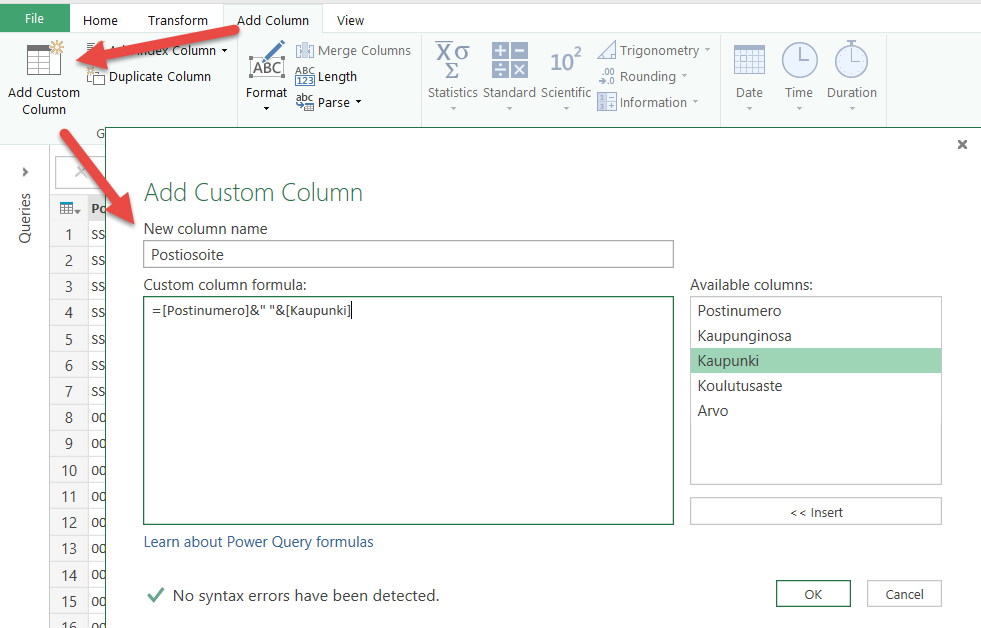 - Mikäli aiot tehdä aineistosta karttakaavioita Excel 2013 -version Power View -kaavioina, sinun kannattaa lisätä aineistoon kaksi saraketta. Yhden, joka sisältää postiosoitteen eli sekä postinumeron että kaupungin ja toisen, joka sisältää kaupungin sekä maan. Voit lisätä sarakkeita komennolla Add Column > Add Custom Column (Lisää sarake > Lisää mukautettu sarake).