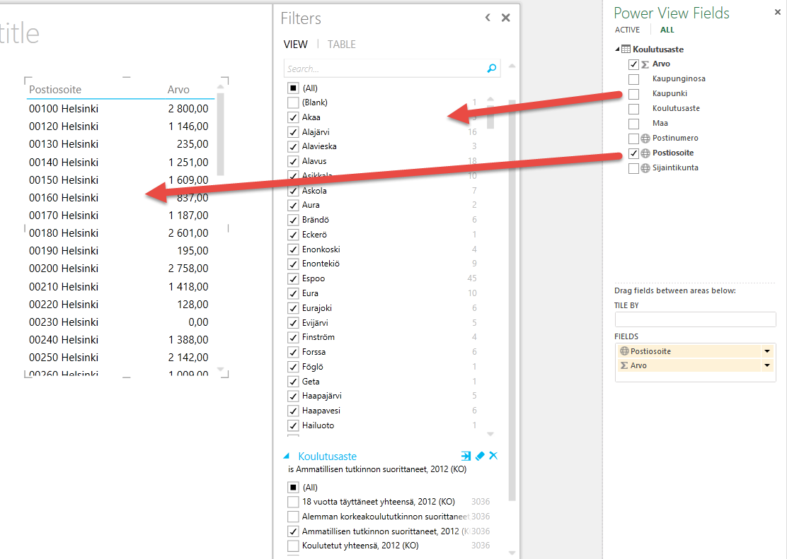 Raahaa tyhjälle arkille ensin postiosoite (huomaa kenttäluettelossa näkyvä maapallon symboli, sillä kenttä on määritetty maantieteelliseksi kentäksi). Rahaa saman arkille ilmestyneen ruudun sisään myös Arvo-kenttä. Vedä tämän jälkeen arkilla näkyvään suodatuspaneeliin Kaupunki ja Koulutusaste. Suodata näkyviin kaikki muut paitsi tyhjät (blank) kaupungit ja valitse vain yksi koulutusasteista.