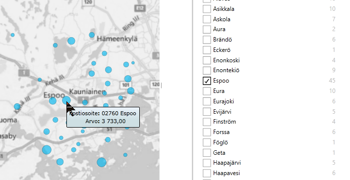 Suodata vain yksi kaupunki esiin ja vie hiiri kartalla näkyvän postinumeron päälle, jotta saat esiin luvun.